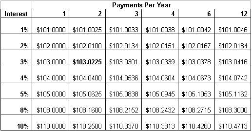 Here is a table with examples of how much you would have if you put your money in the bank for one year based on different rates of compounding. For example, if you earn 3% per year and there are payments every 6 months, that is 2 payments, so $100 put in the bank under those terms would result in a value of $103.0225 after a year.