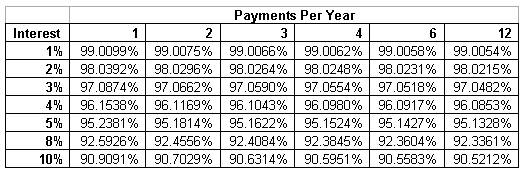 And here is the same table expressed as discount factors, which are the ratio of present value divided by future value: